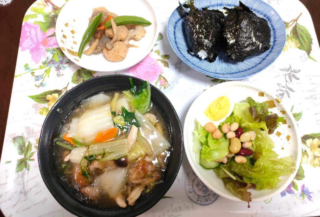 煮物、サラダ、白菜と豚肉のうま煮、お握り…