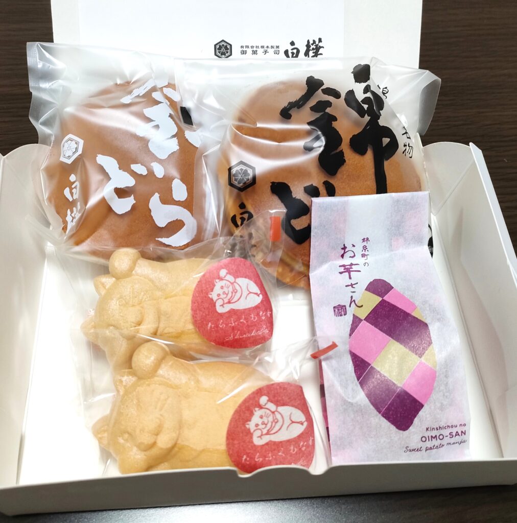 「たらふくもなか」は寝そべっているぽっちゃり招き猫で縁起のいい最中らしい