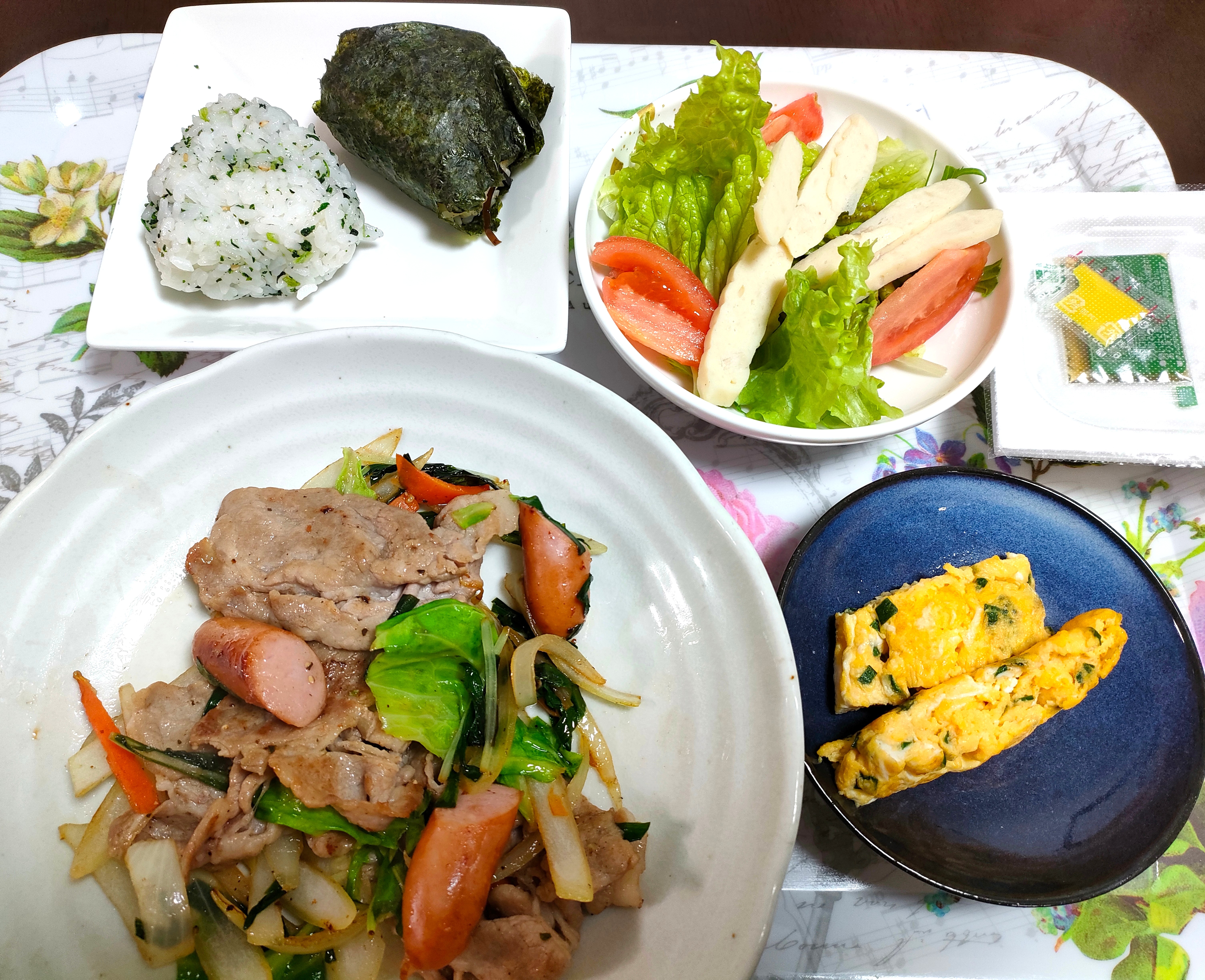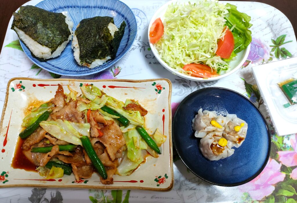 焼肉炒め、サラダ、シュウマイ、納豆、お握り…そしてハイボール2~3杯です