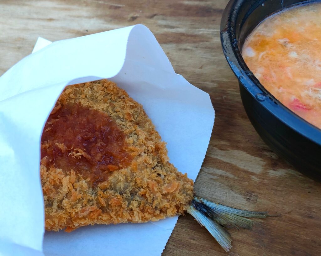 珍しく揚げたてのアジフライとあら汁を見つけた