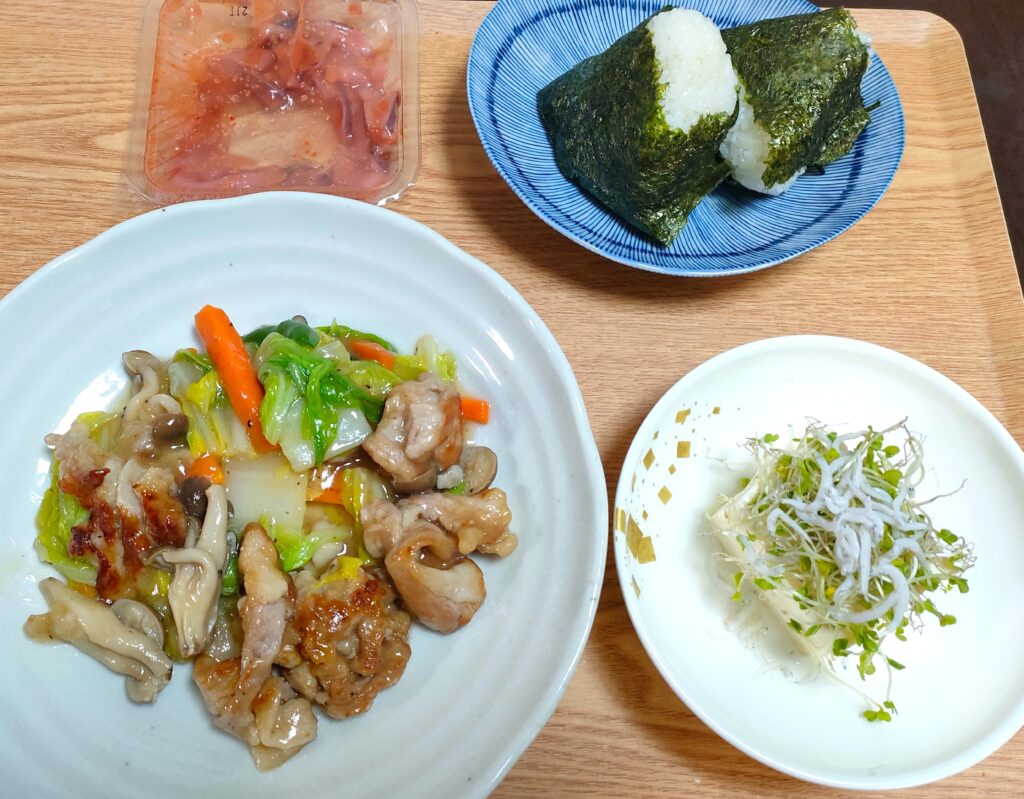 白菜と豚肉のうま煮、豆腐のブロッコリースプラウトとしらすのせ、イカ明太、お握り…