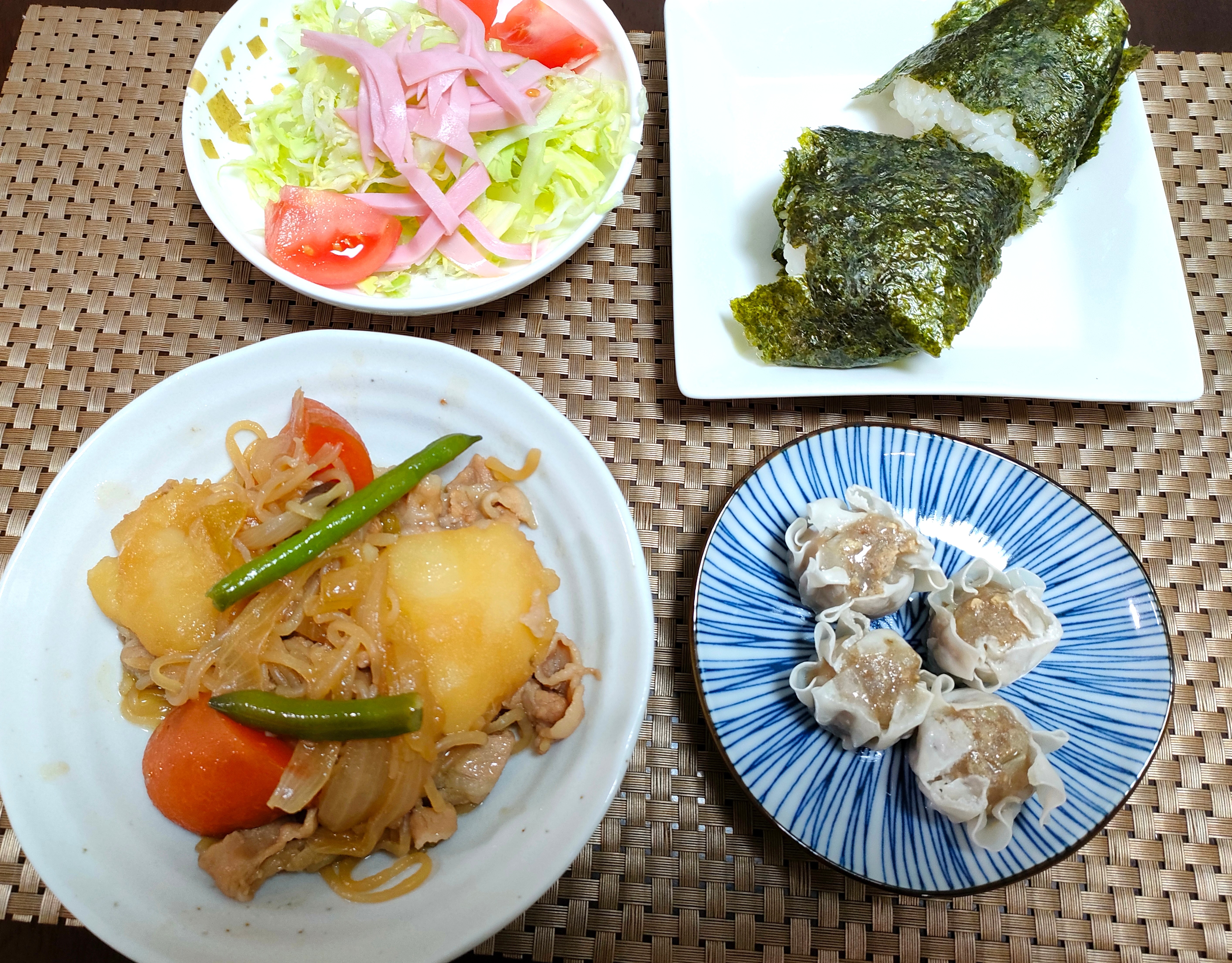 白菜と豚肉のうま煮、豆腐のブロッコリースプラウトとしらすのせ、イカ明太、お握り…