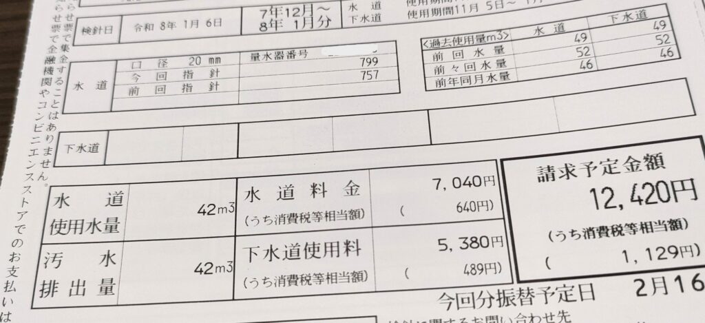 11月5日~1月6日(2ヶ月分)の水道料金です