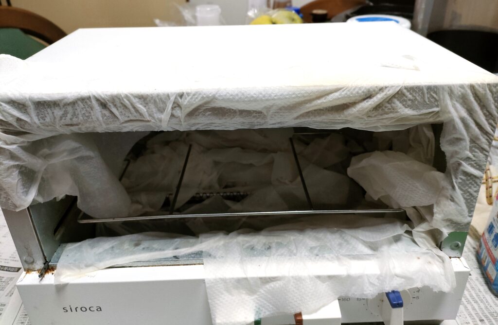 オープントースターで焼いたのですがニンニクバターを多く乗せたので溶け出し下に落ちたのです