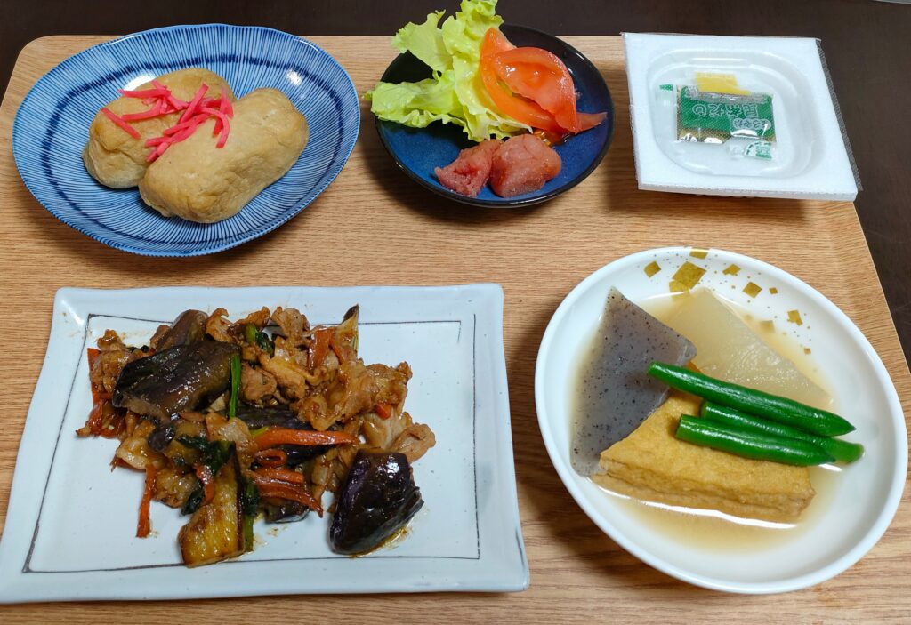 ナスと豚肉の味噌炒め、おでん(昨日の残り)、お稲荷さん(昼食で作った残り)、辛子明太子とサラダ、納豆…そしてハイボール