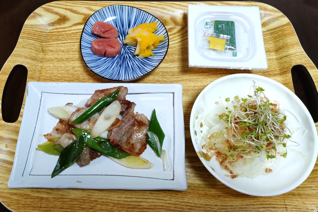 豚肉と葱のニンニク炒め、新タマネギのサラダ、辛子明太子とイカ、納豆…