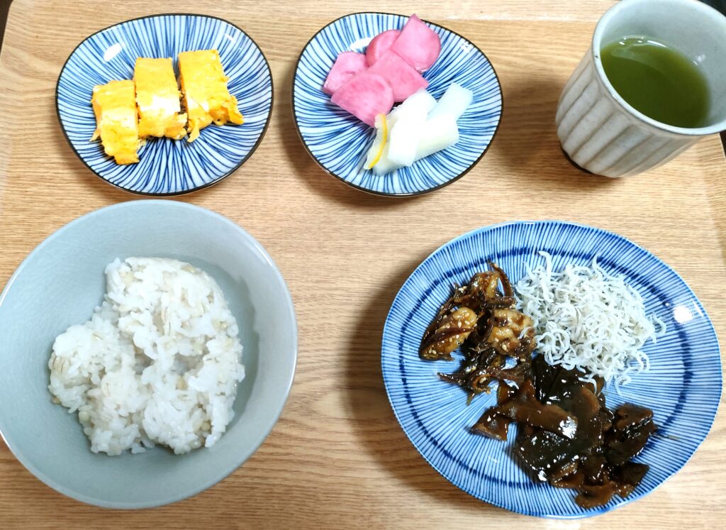 それではと漬物と佃煮で…ご飯もお代わりし一気に食べていた