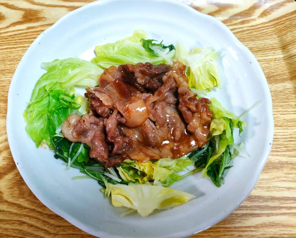 タンパク質を取らなくちゃとレンチンしたキャベツに焼肉です