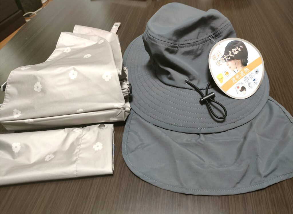 日傘はUVカットで晴雨兼用・帽子は遮光、遮熱です、そして首の後ろが日焼け防止のネックカバー付き